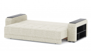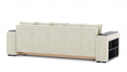Механизм трансформации - еврокнижка. Наполнение: ПБ + высокоэластичный ППУ. Полка ЛДСП только в одном подлокотнике. Ящик для белья - есть. Чехлы подушек - несъемные, наполнение - крошка ППУ.