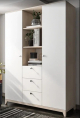 Распашные двери. Плательные отделения. Две открытые полки. Три выдвижных ящика на шариковых направляющих. Ручки - кнопка. Цоколь шкафа - деревянное основание высотой 100 мм.