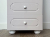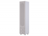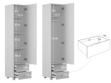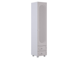 Модуль оснащён одной распашной дверцей и двумя вместительными выкатными ящиками в нижней части, предназначенными для хранения одежды, текстиля или аксессуаров. Внутреннее наполнение можно выбрать в зависимости от потребностей: шкаф может быть укомплектован полками или штангой для плечиков, что делает его удобным для хранения как сложенных вещей, так и одежды на вешалках. Оригинальные круглые ручки и опоры дополняют дизайн, придавая шкафу аккуратный и современный внешний вид.